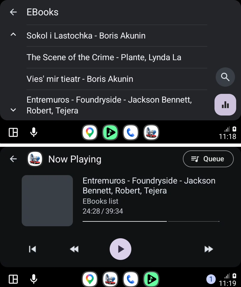 The main @Voice app focuses on reading and playback. For in-car control, there is also a companion called @Voice Auto Plugin, designed so you can choose items and control playback from Android Auto.