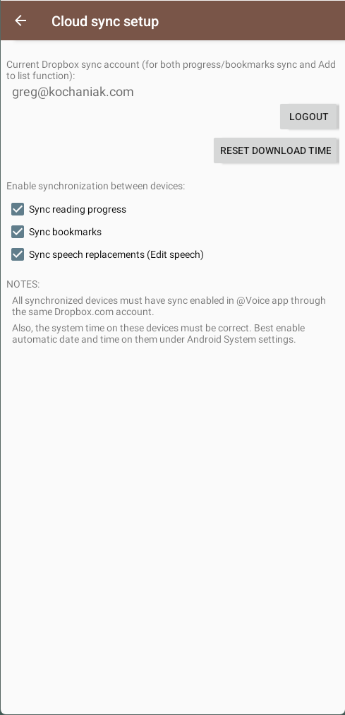 @Voice can synchronize reading positions, bookmarks, lists, and certain custom reading data through Dropbox so multiple devices stay aligned.